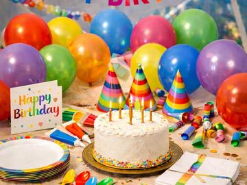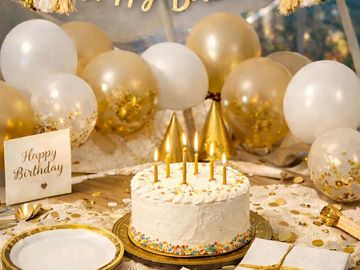 Celebrate with a beautifully decorated birthday setup waiting in your dome. Includes a delicious 10-inch cake (vanilla or chocolate), elegant champagne gold, beige, and white décor, balloons, party hats, candles, and a birthday card. Paper plates, napkins, and plastic cutlery are also included for easy celebrating.