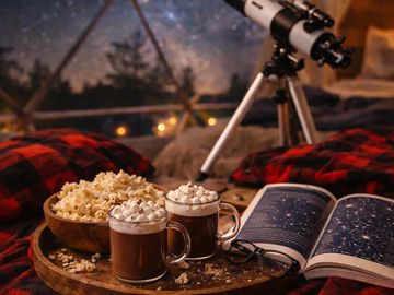 Enjoy two buffalo plaid blankets, 2 x hot chocolate, mini marshmallows and 2x microwave popcorn while exploring the stars with your own telescope and included constellation guide.